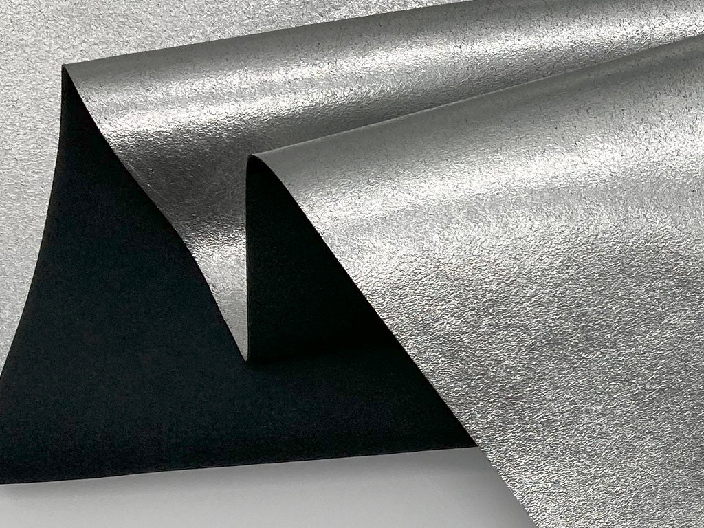 金属の光沢感を持つ全面に箔加工を施したスエード素材です。