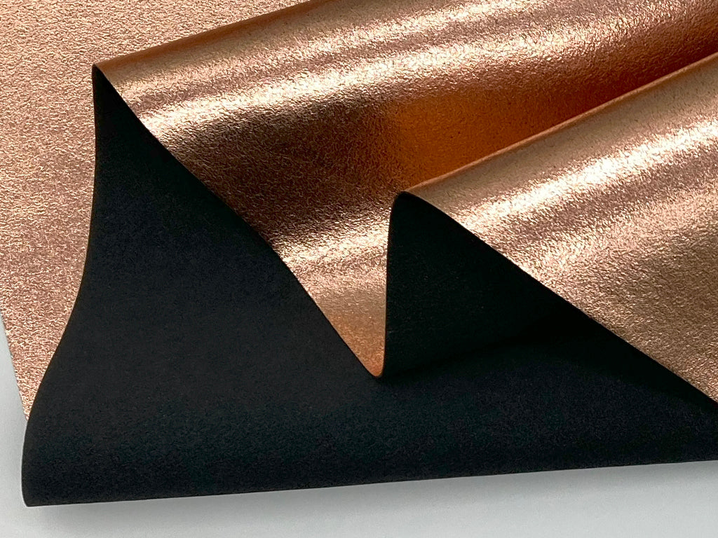 金属の光沢感を持つ全面に箔加工を施したスエード素材です。